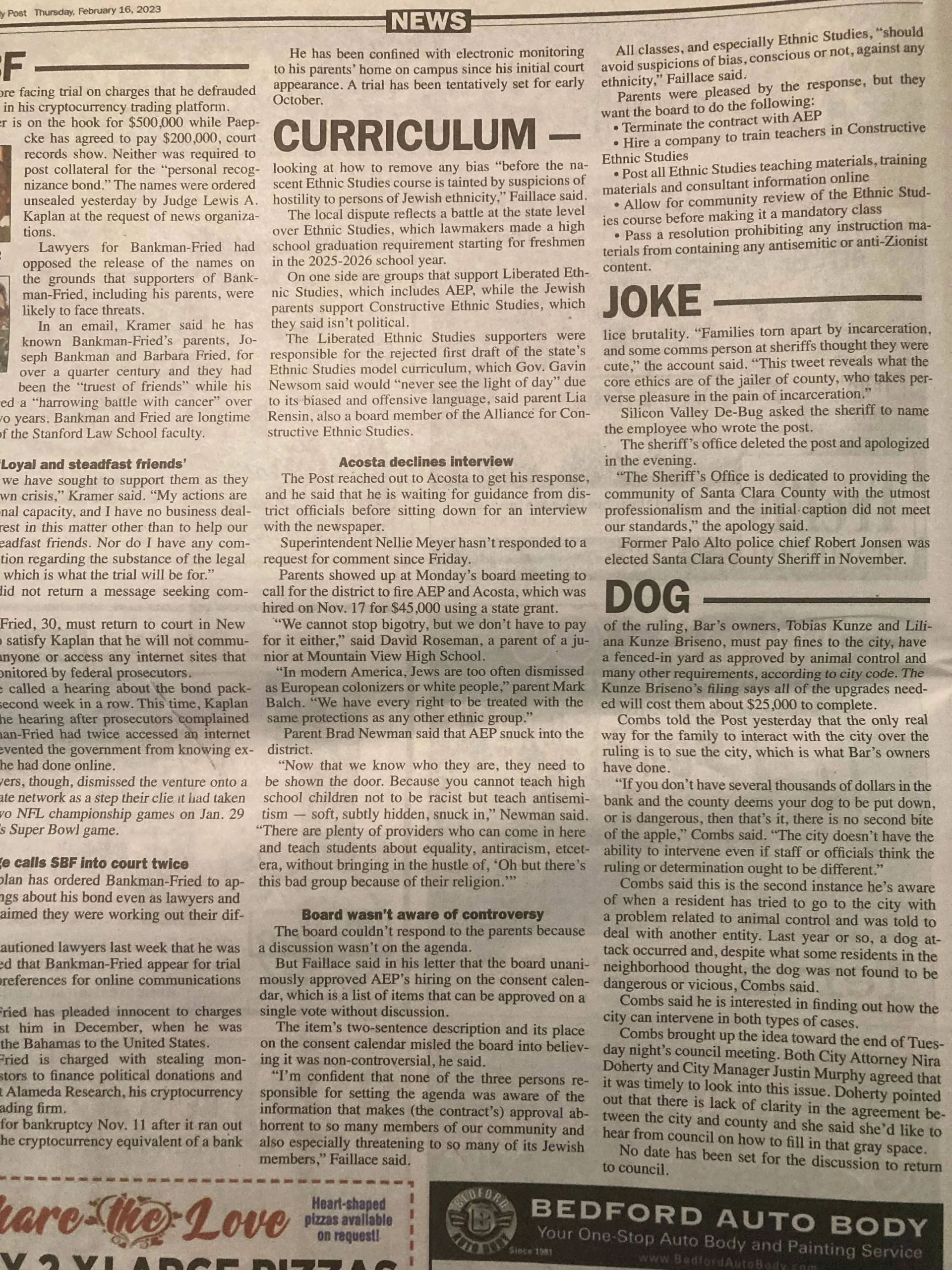 Board President Phil Faillace wrote back to the Jewish parents that board members didn't know AEP was controversial when they approved the contract in November. Administrators and lawyers are looking at how to remove any bias "before the nascent Ethnic Studies course is tainted by suspicions of hostility to persons of Jewish ethnicity," Faillace said.